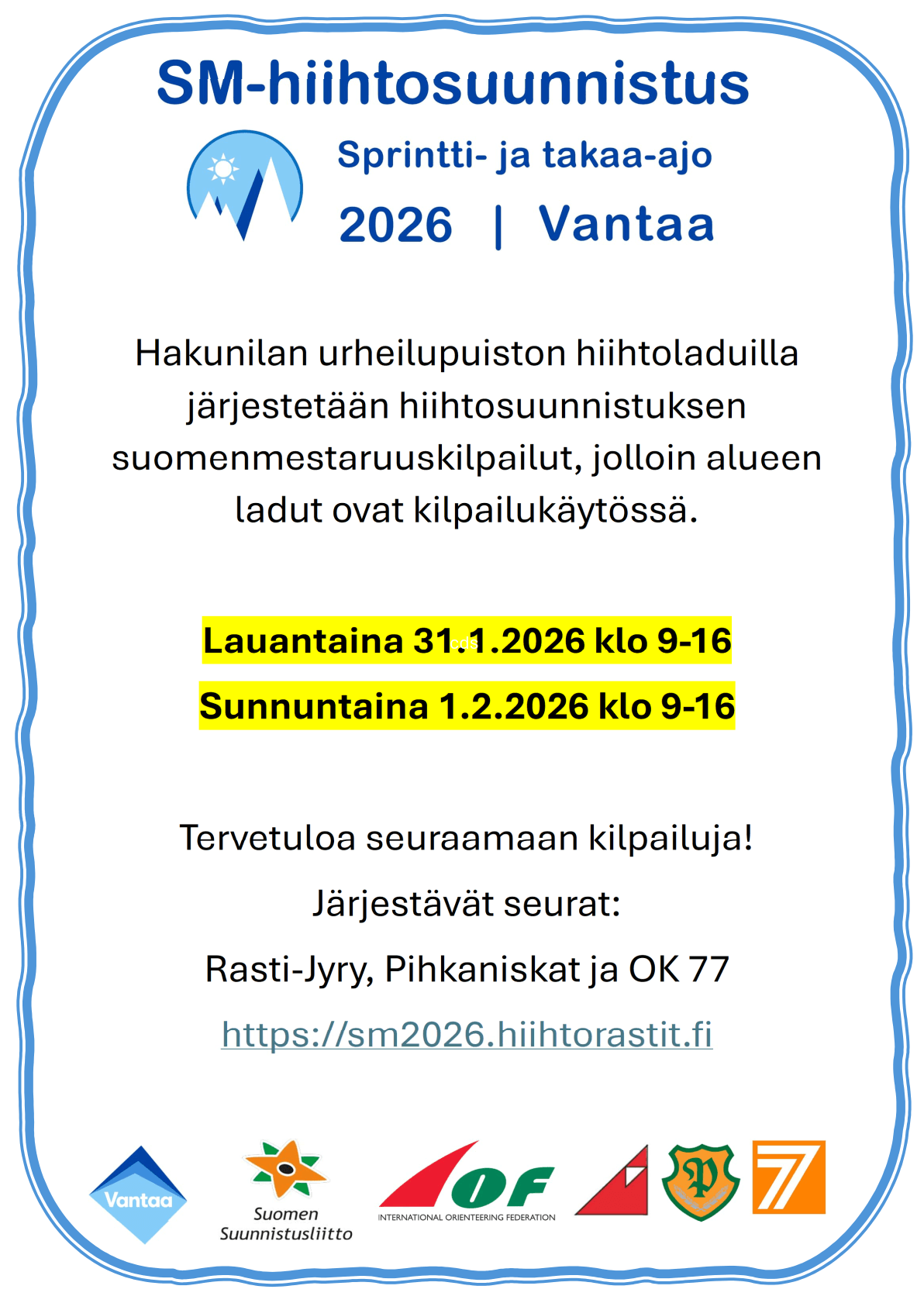 Hiihtosuunnistuksen SM-sprintti, SM-takaa-ajo ja Vantaan hiihtorastit Vantaan Hakunilassa 31.1.–1.2.2026